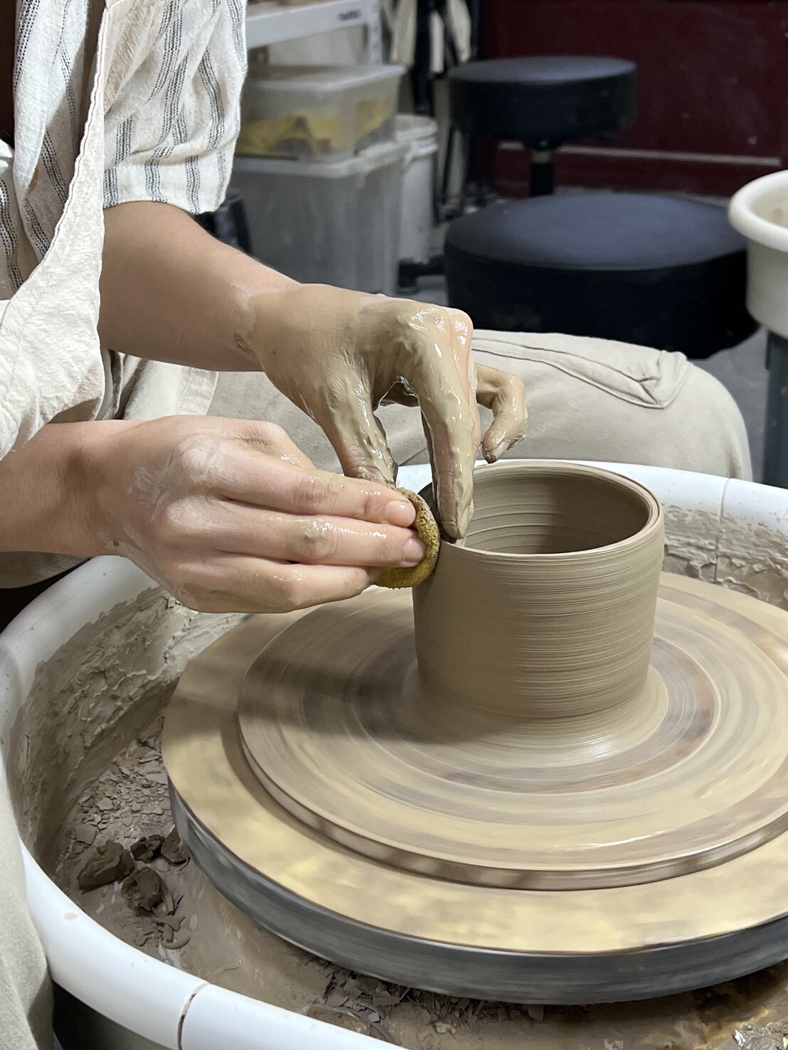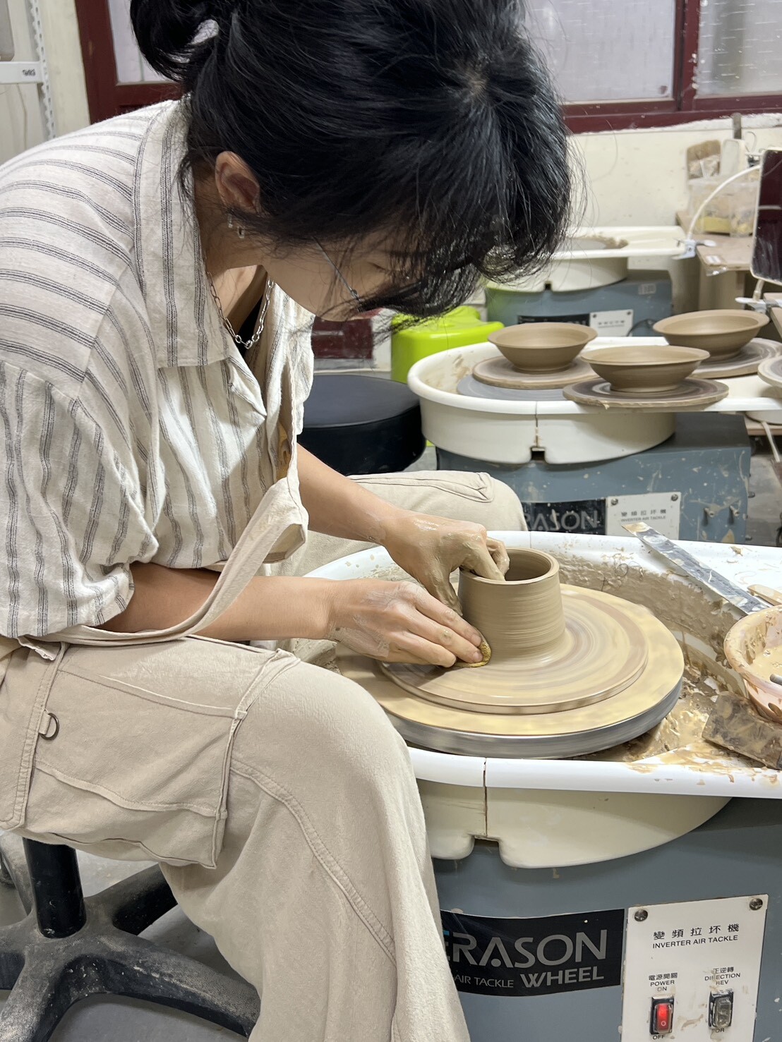 - 使用拉坯機器進行手拉坯操作
