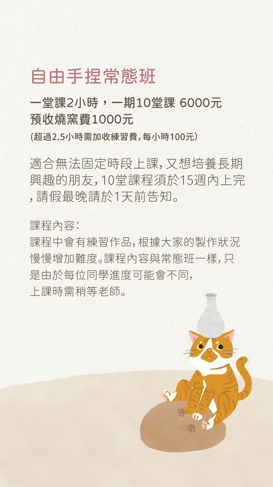 自由手捏並非團體課程,當基本成型上完之後,可以請老師先教手拉坏。